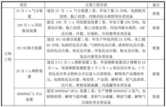 项目建设内容:主要建设1套25万吨/年气分装置、1套100万吨/年丙烷脱氢装置、1套28/60万吨/年PO/SM联合装置、2套5×2万t/a顺酐装置和1套9000Nm3/hPSA装置及配套的公辅工程和环保工程。
