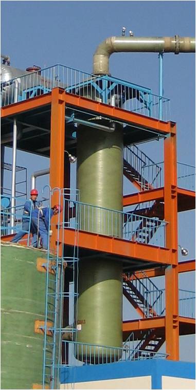 降膜吸收器后烟气进入碱洗填料塔,实现用碱性洗涤液高效地对烟气进行最终的洗涤处理,通过酸碱中和反应把去除烟气中剩余微量HCl和Cl2,保证烟气排放达到国家标准。